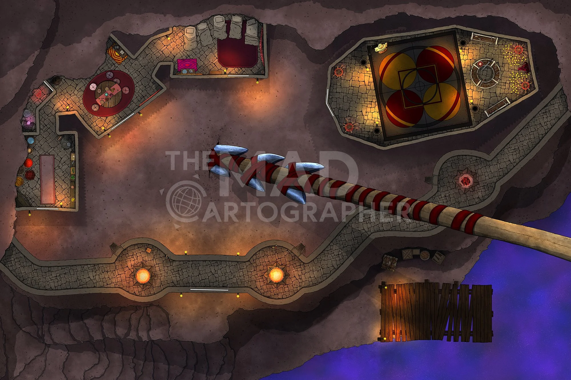 MONASTERY CRECHE | 30x20 | Temple-fortress on a celestial being’s husk, built around a giant spear, with prayer and training areas. [🏨 Multi-floor Map]