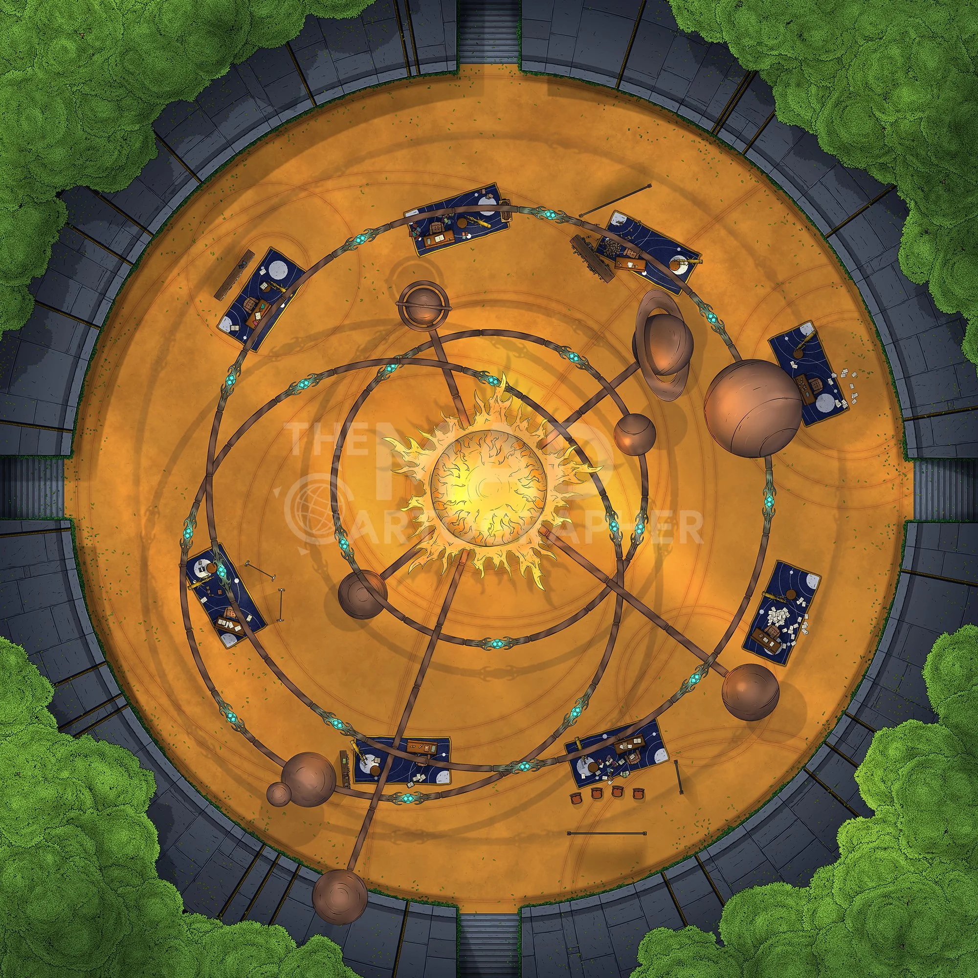 THE GRAND ORRERY | 30x30 | Studio with a rotating solar system model, desks, and optional tree canopies for research. [🪑 Asset Variants]