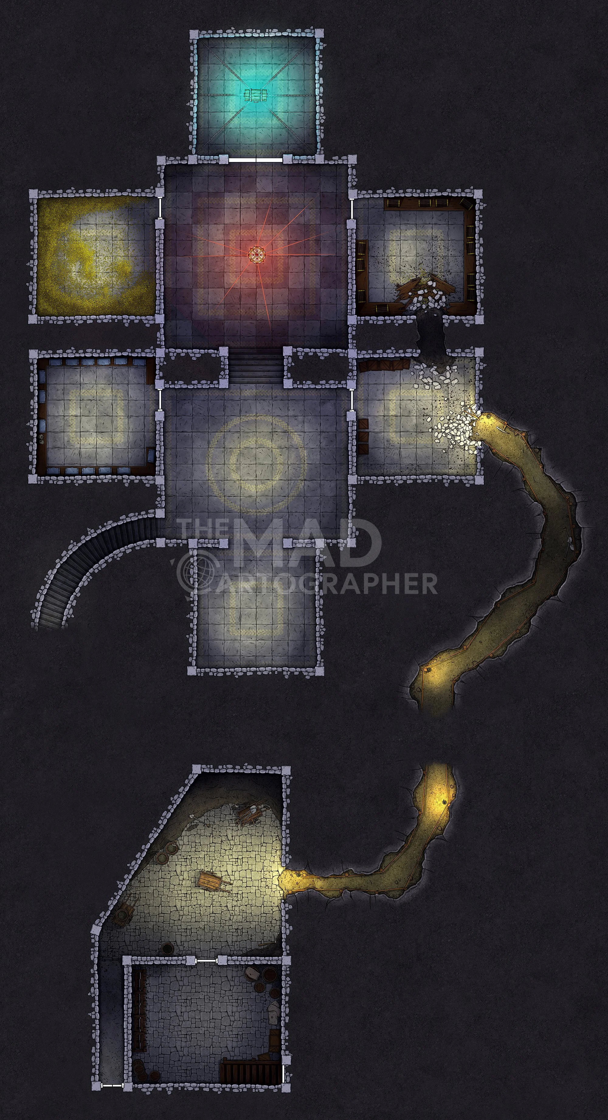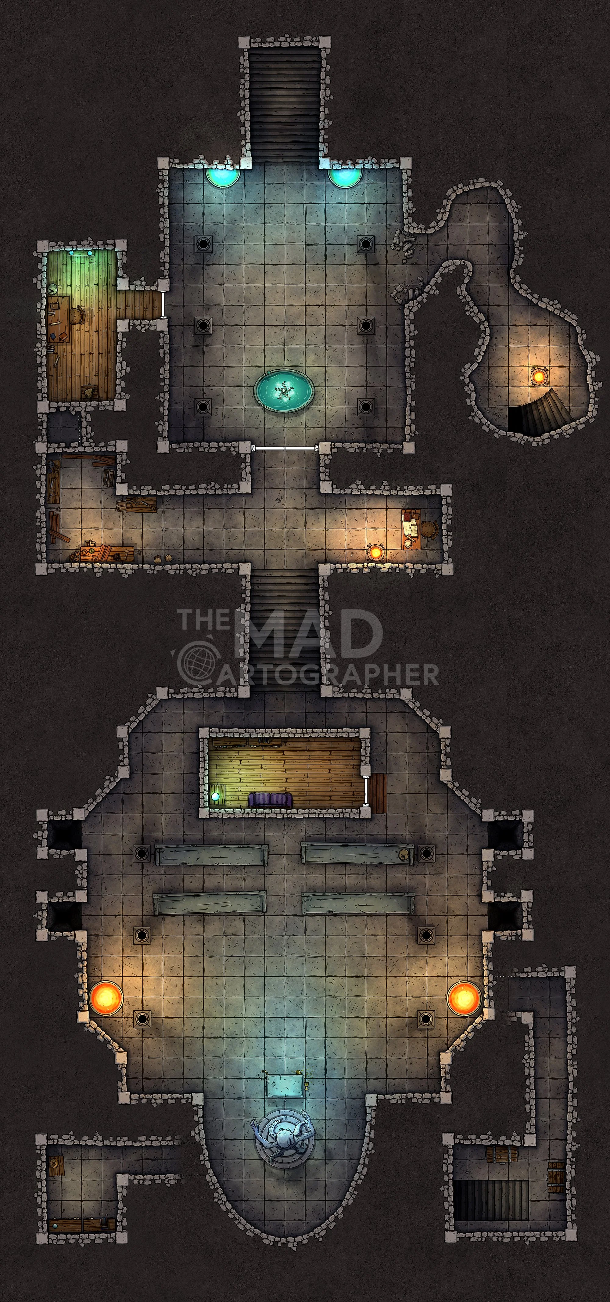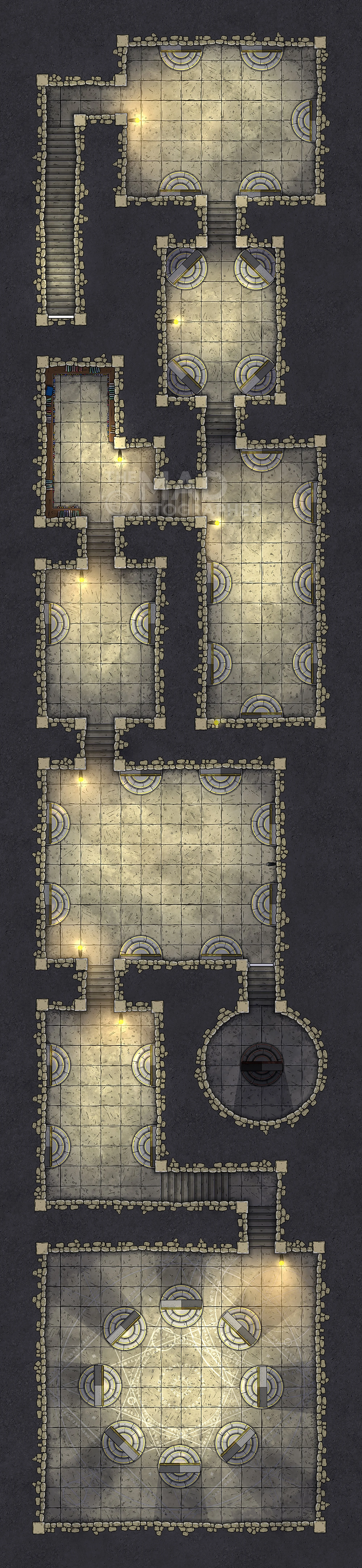 YELLOWCREST | 15x31 | Cultist lair with a dark temple service, cloisters, libraries, and pits leading to an oubliette dungeon.