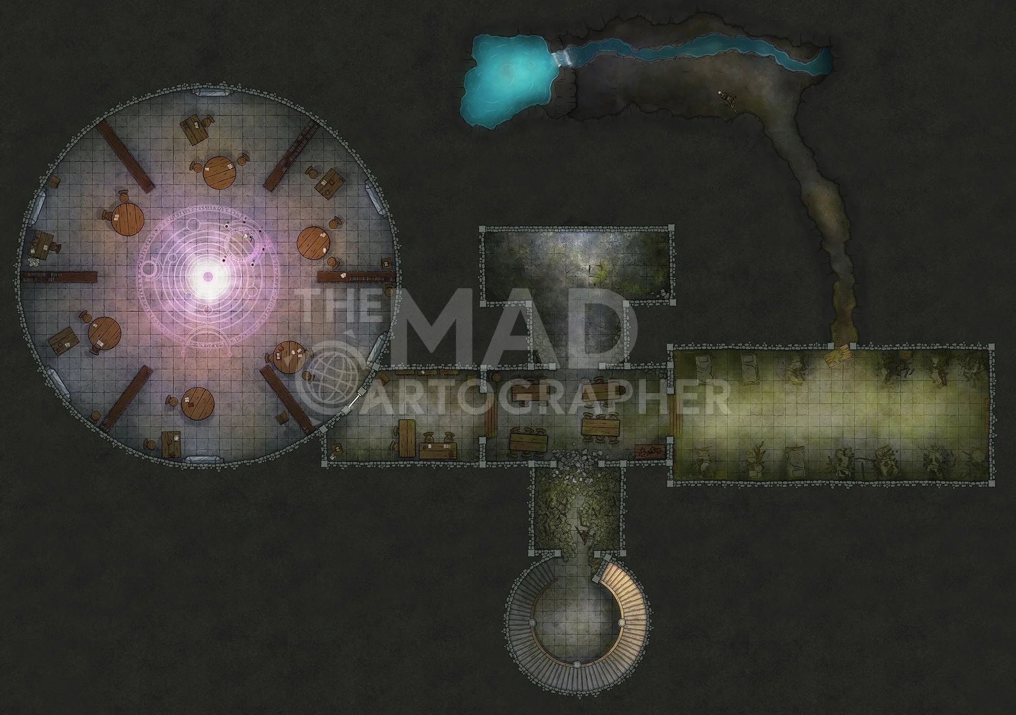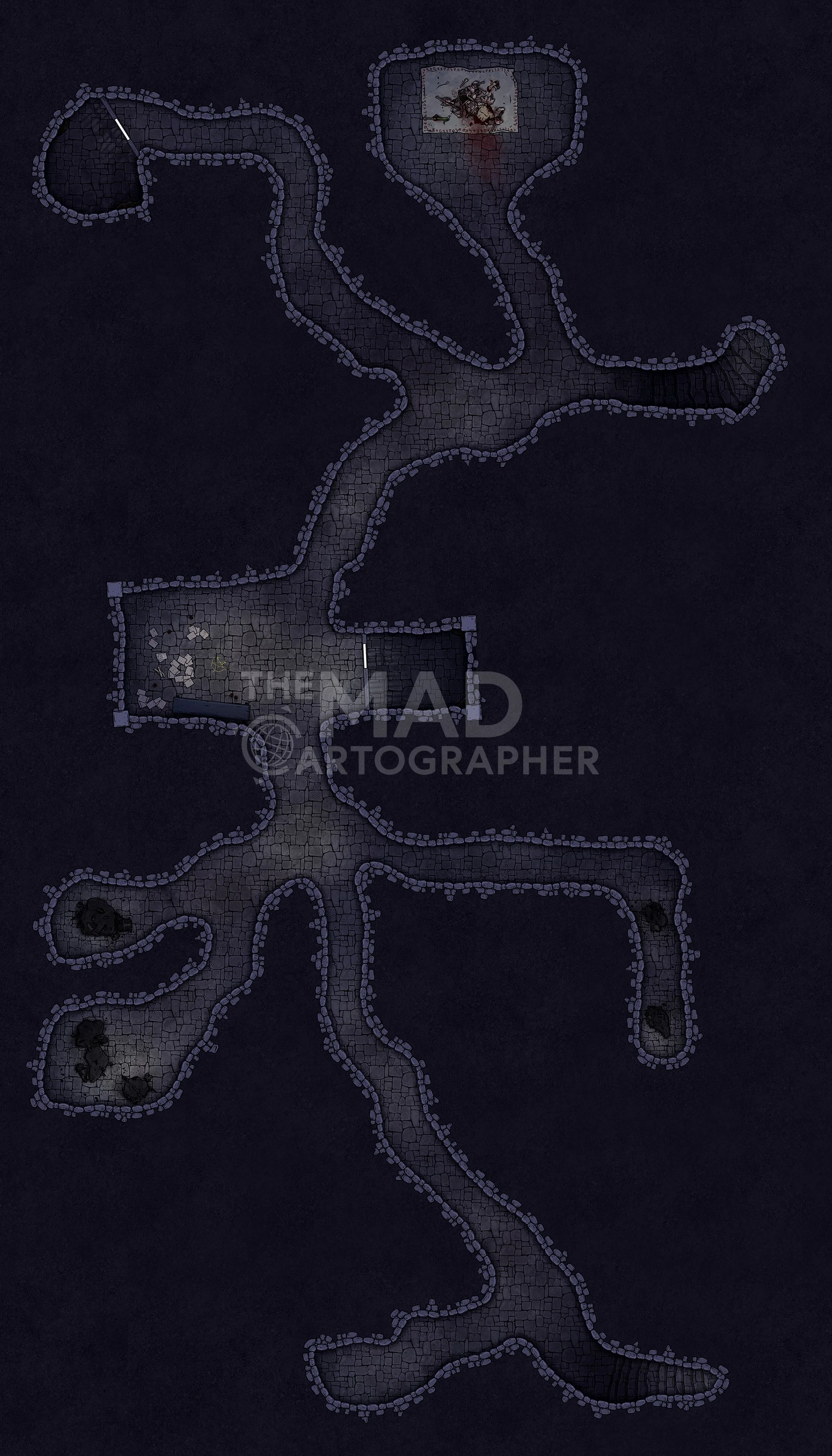 HAVEN OF RED QUILLS | 44x31 | Ruined underground lair with an unfinished ritual and collapsing sections near a natural cavern spring.