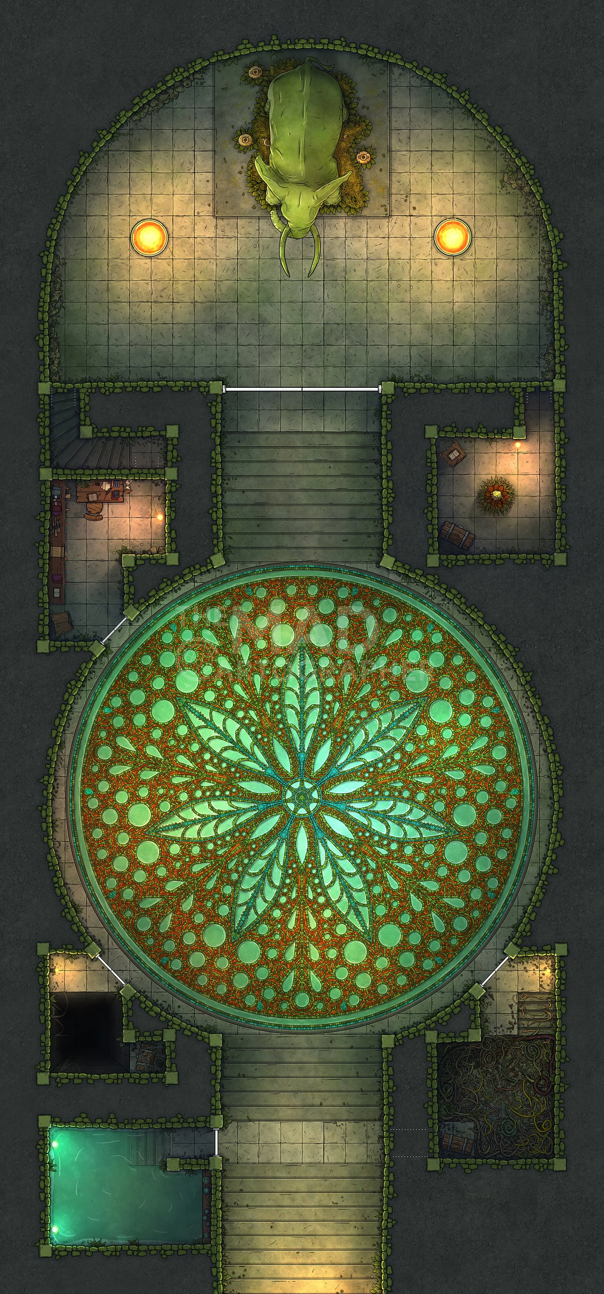 JADE TEMPLE | 14x30 | Jungle temple with a stained glass floor, dense foliage, and a jade elephant statue altar.