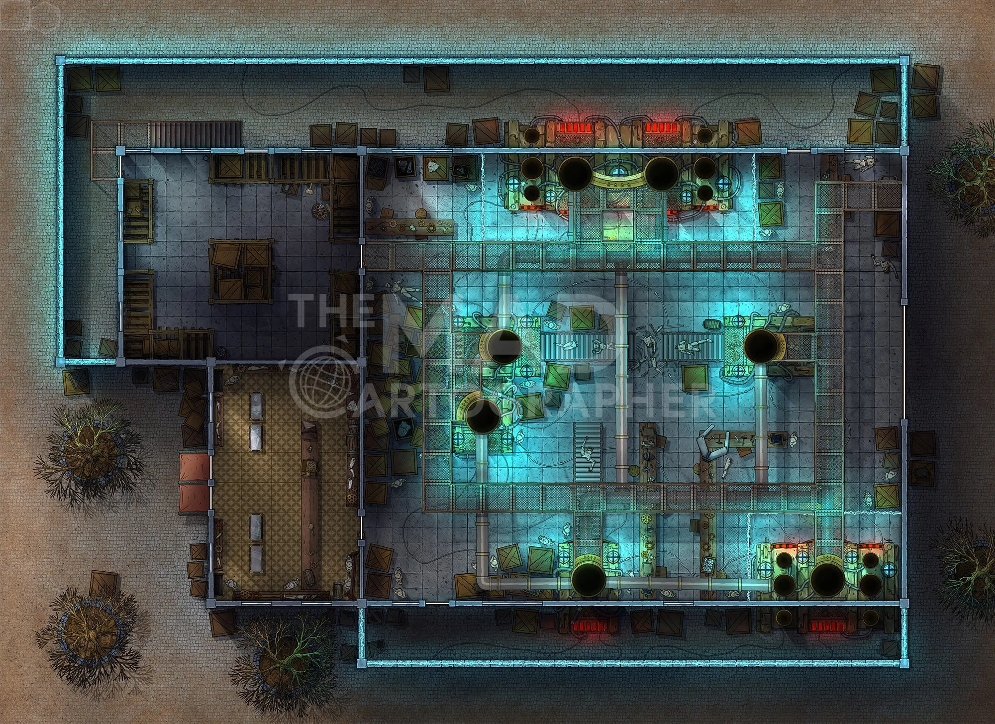 FAULTY FACTORY | 30x20 | A large factory filled with haywire machinery, upper walkways and private offices. [π Night & Day Variants] [π¨ Multi-floor Map]
