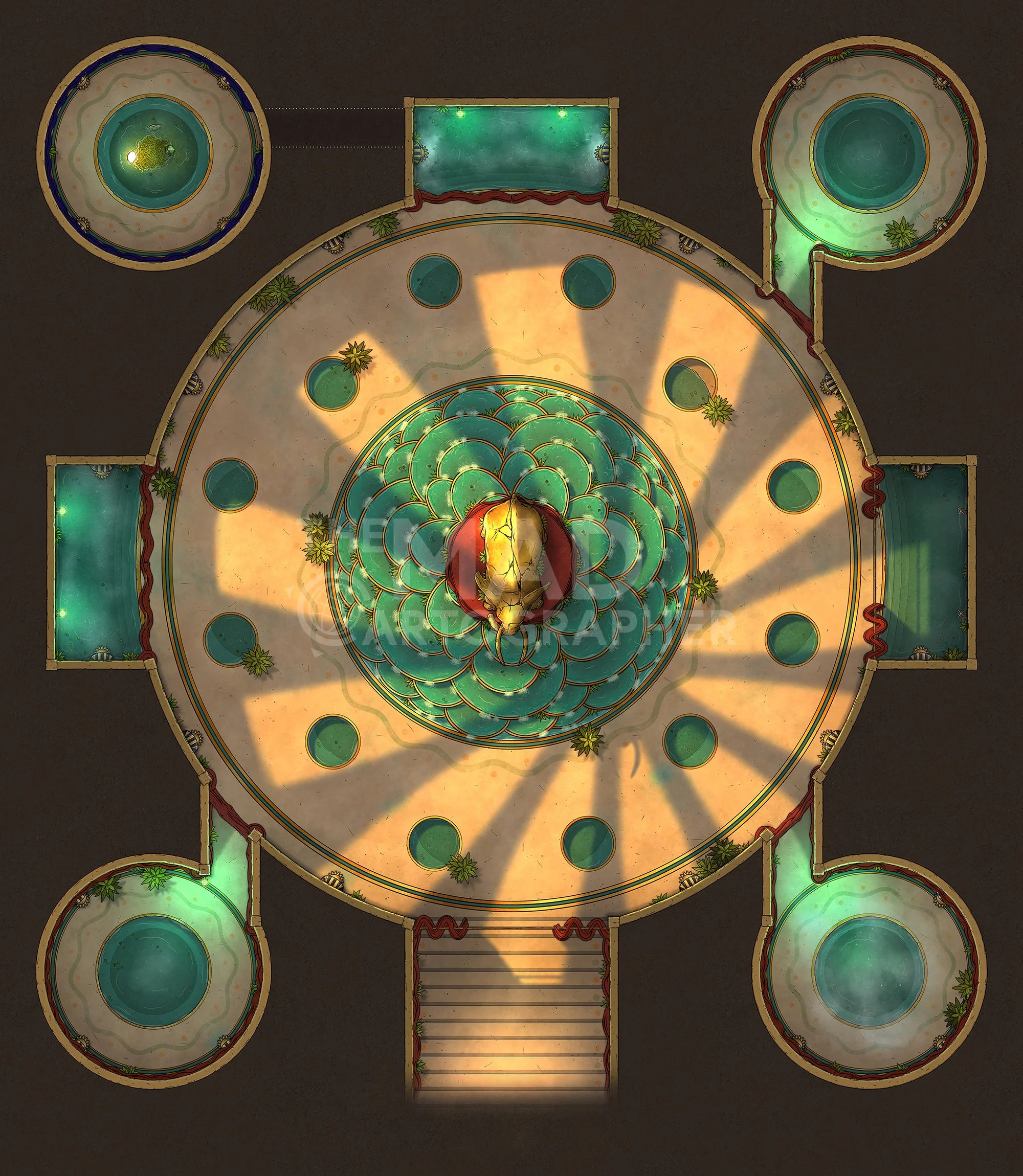 DESERT SUMMONING | A dynamic, progressing battle map with three pylons of gold and emerald. As the ritual unfolds, a titanic skeleton emerges from the sands, ideal for climactic encounters. [🪑 Asset Variants]