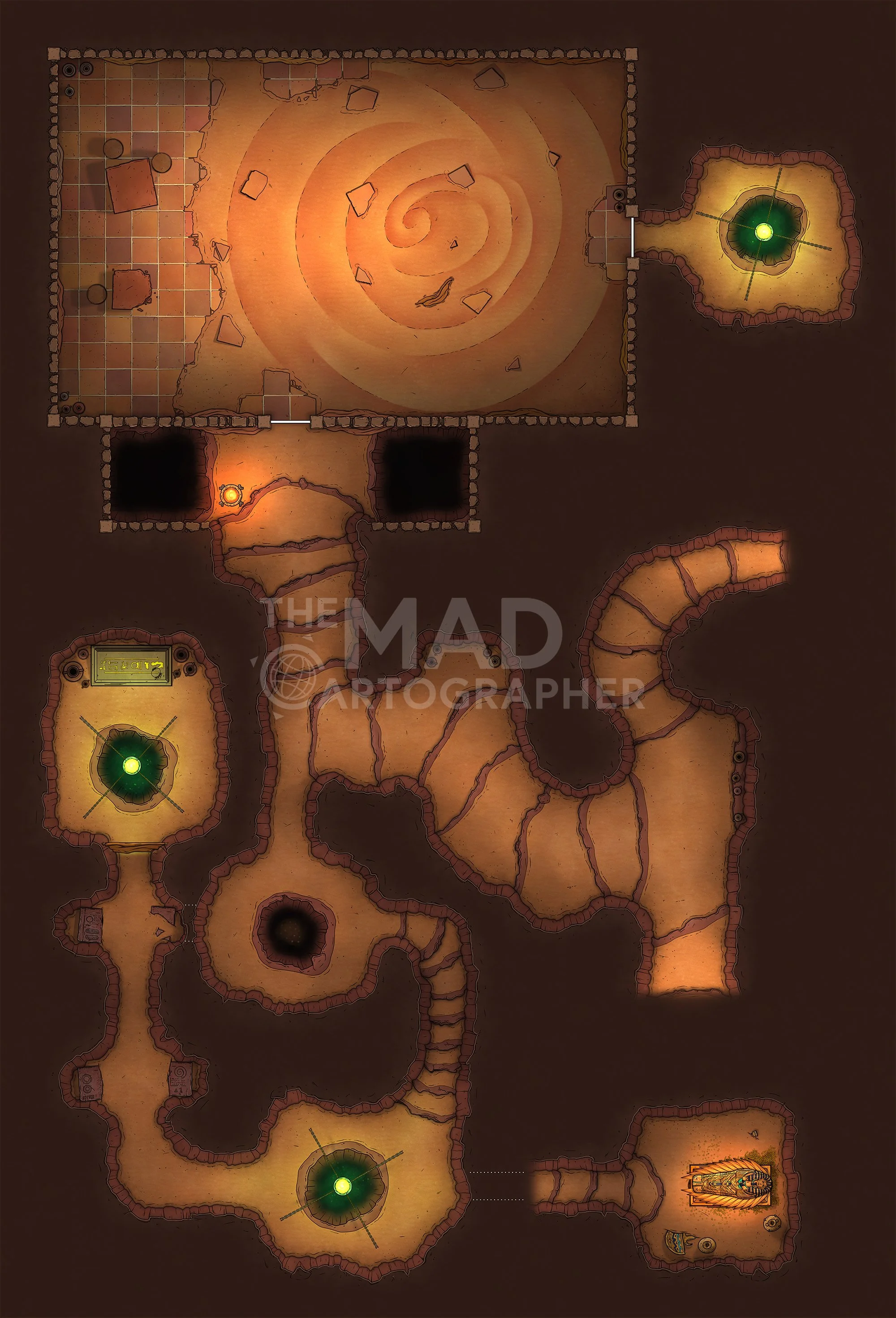 DESERT SANDTRAP | 17x25 | Inside a small desert shrine’s cave, an underground cloister with enchanted braziers, traps, and ancient treasures of a long-gone empire.