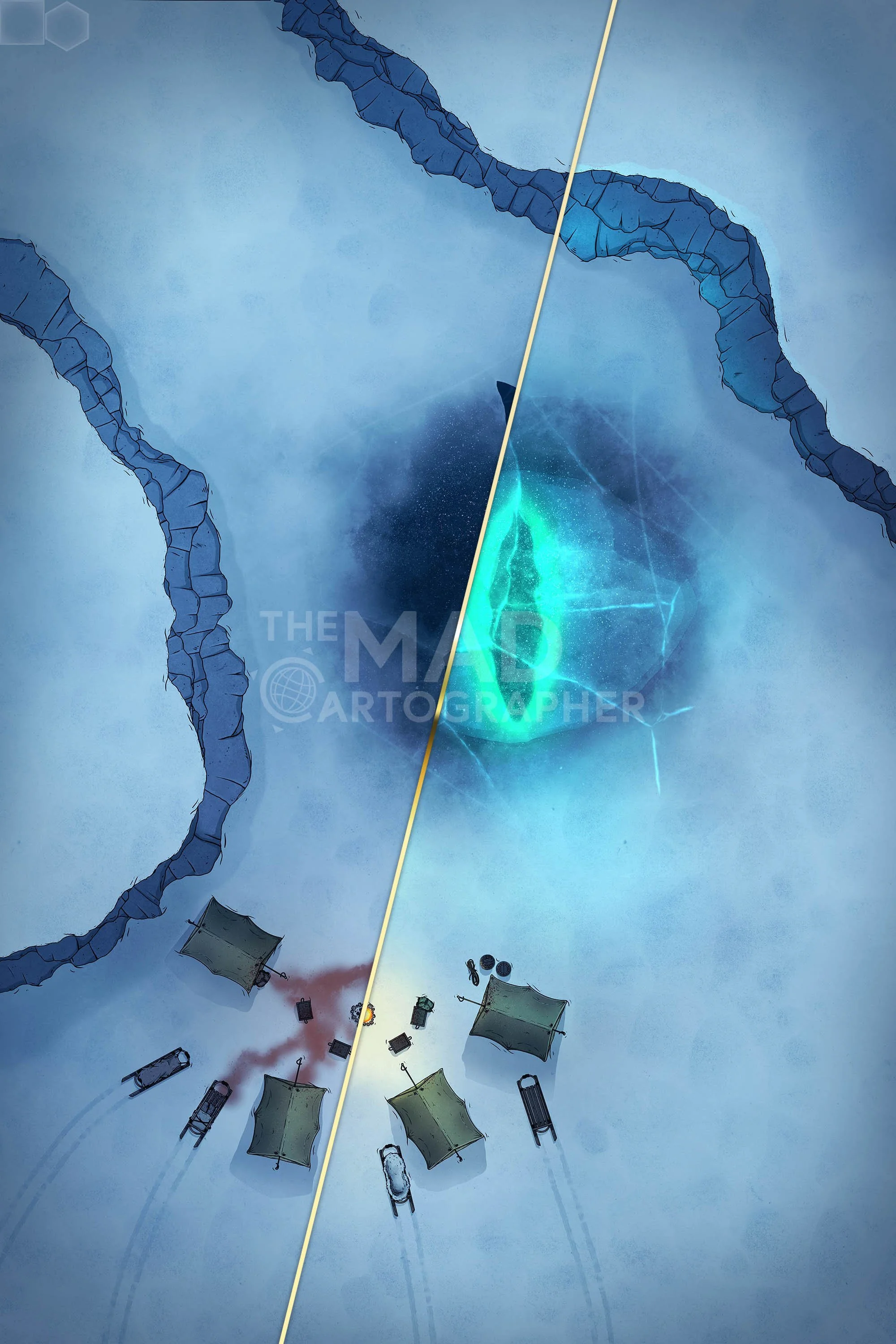 UNDER THE ICE | 20x30 | A camp on an icy lake, with a thinning spot revealing a hidden horror. [πͺ Asset Variants]