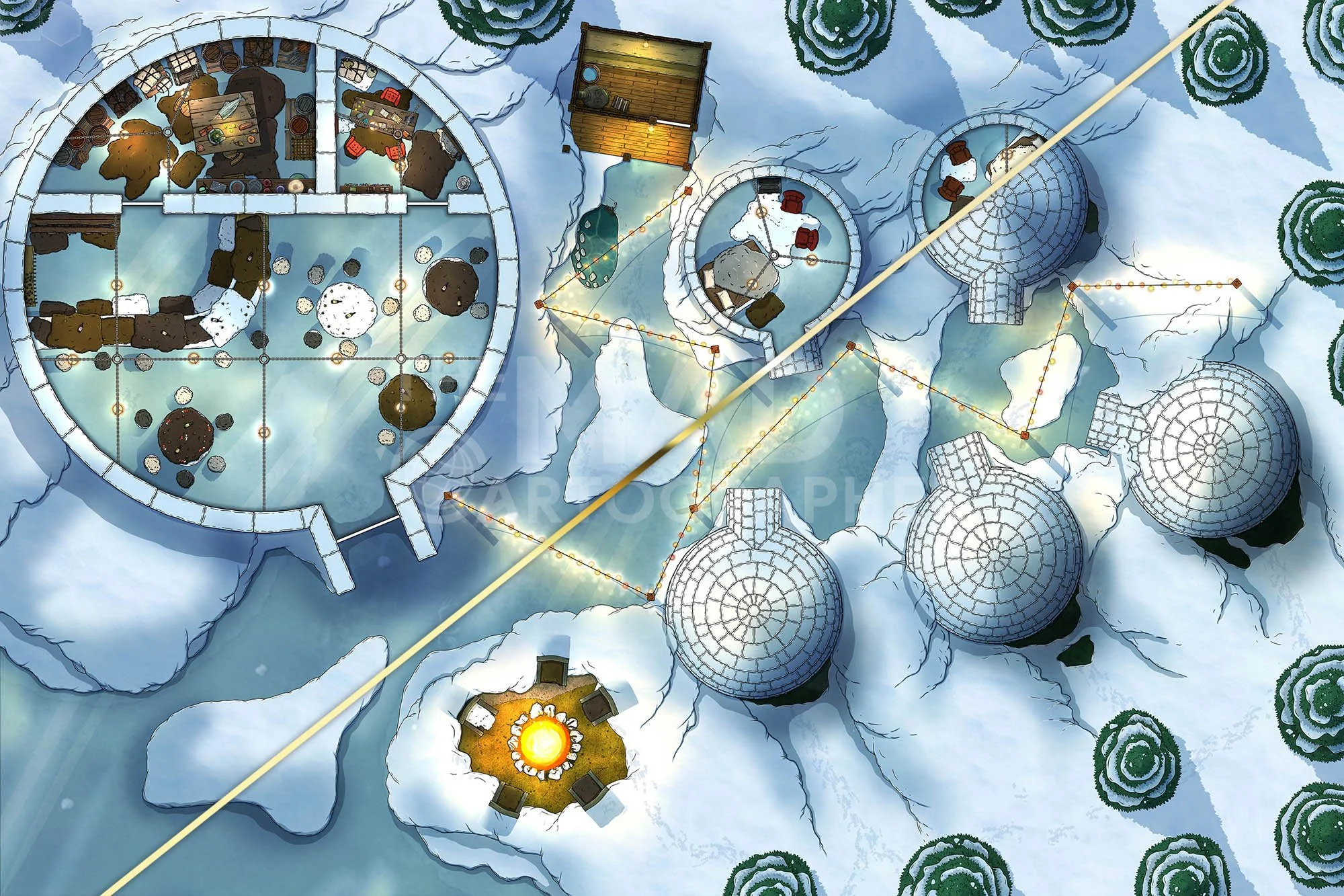 ICEHAUS | 33x22 | An ice-built tavern or resort with several homes, providing respite in the far North. [π Night & Day Variants]