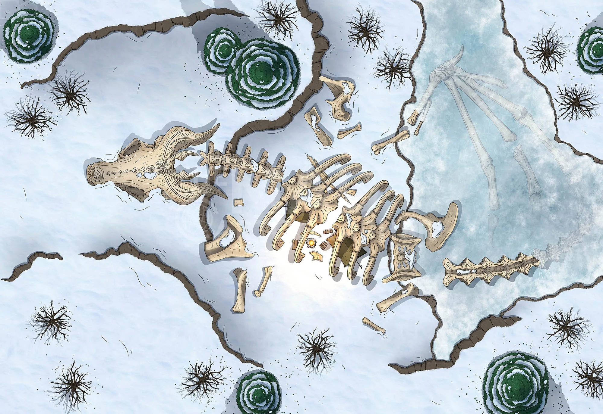 DRAGON BONES | 30x20 | A giant dragon skeleton with runes, where travellers can camp inside the ribcage. [π Night & Day Variants]