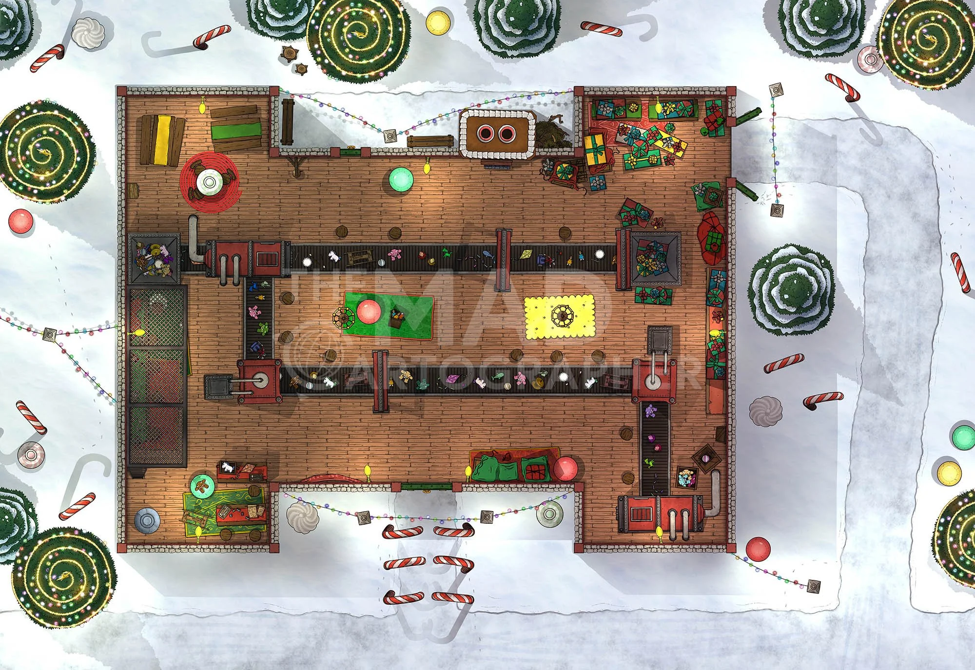FESTIVATE FACTORY | 30x20 | A snow-covered workshop with conveyor belts making toys, overseen by a large metal platform. [π Night & Day Variants]