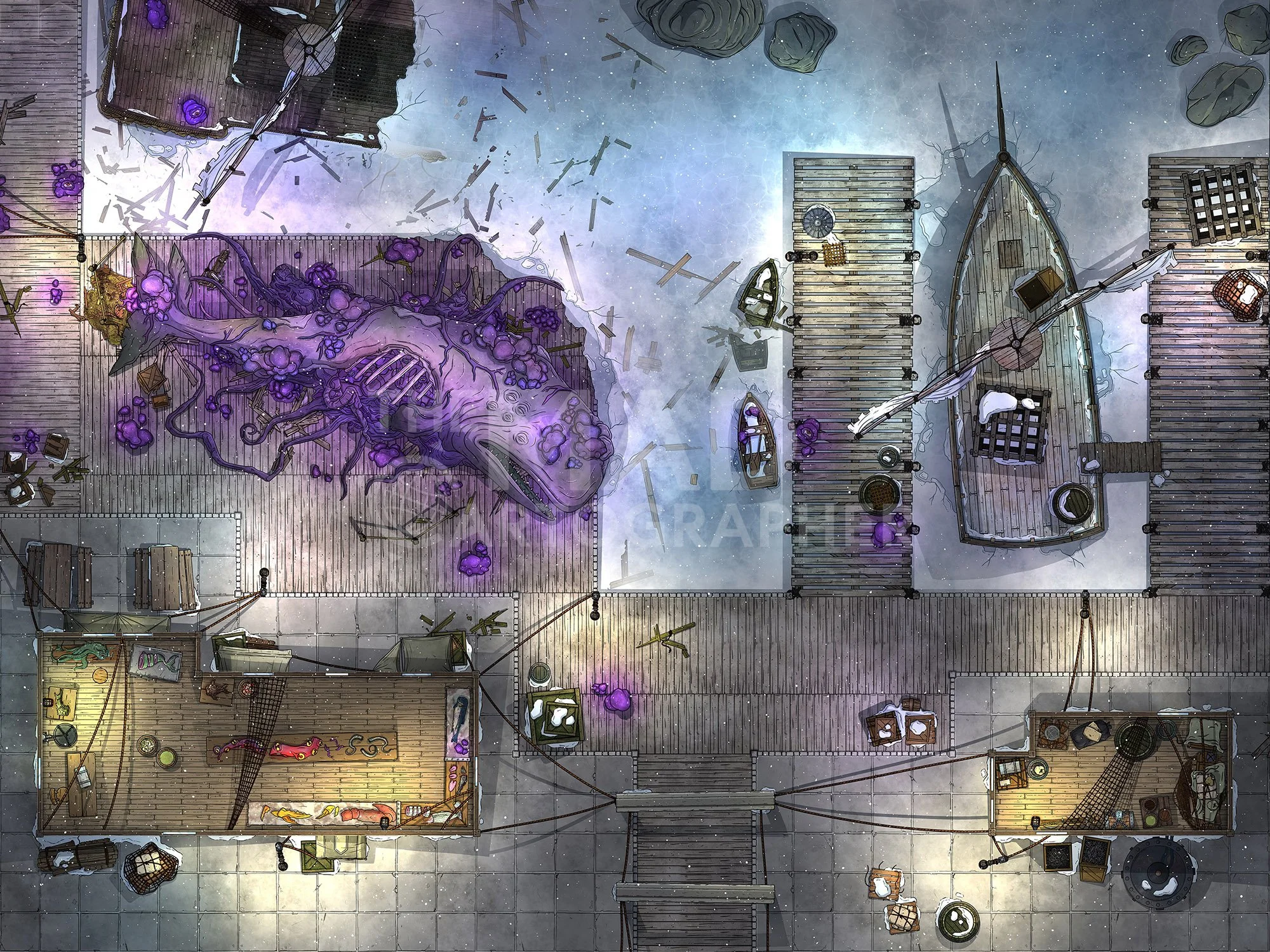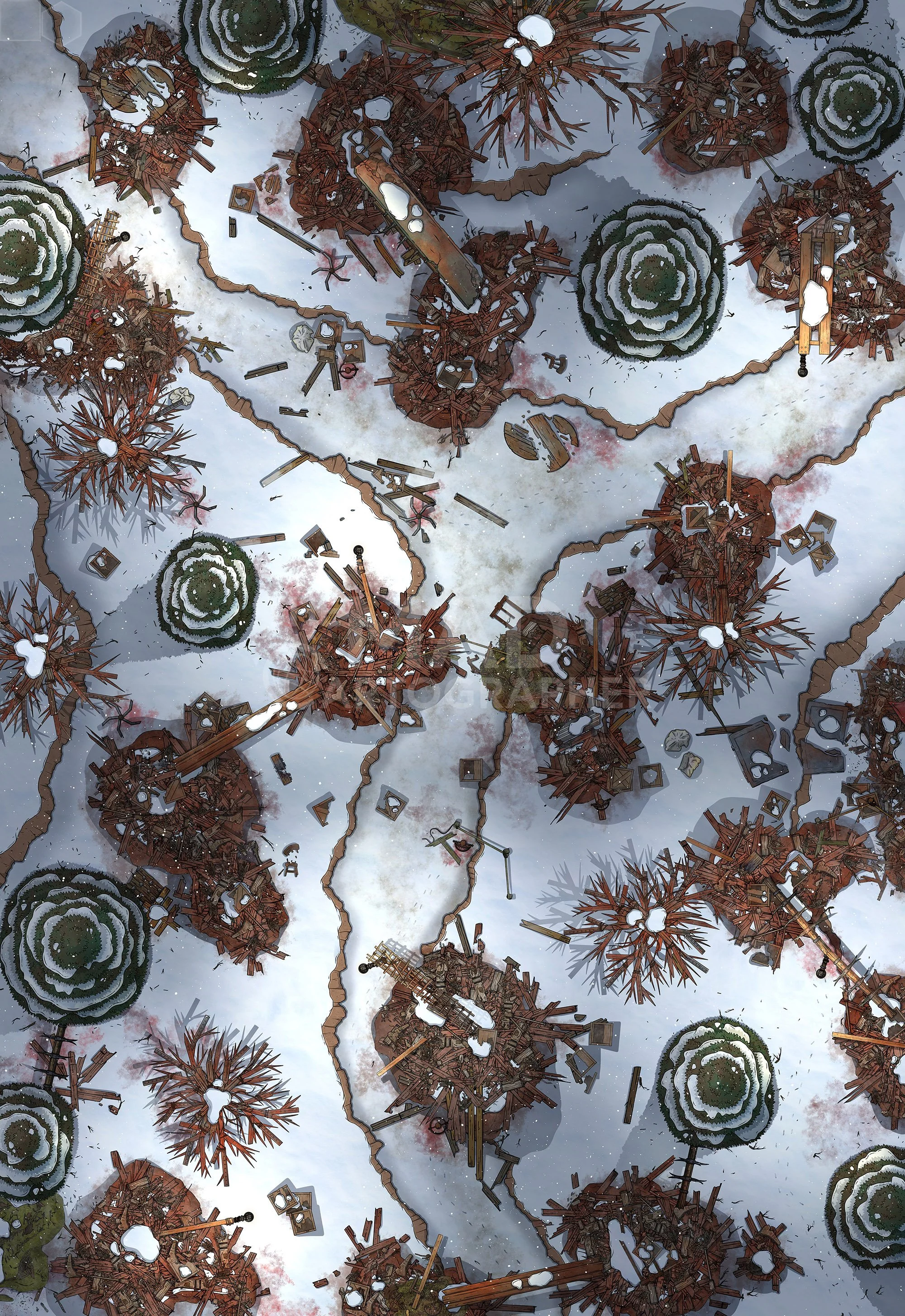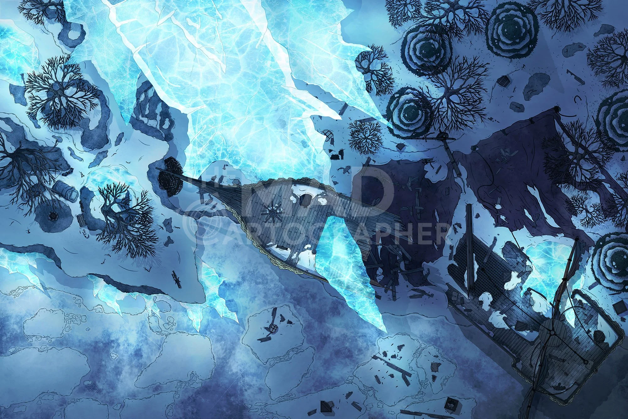 WRECK OF THE ICE KNIFE | 30x20 | A wooden ship has been flung onto the shoreline and impaled on a giant pillar of ice. [π Night & Day Variants] [π¨ Multi-floor Map]