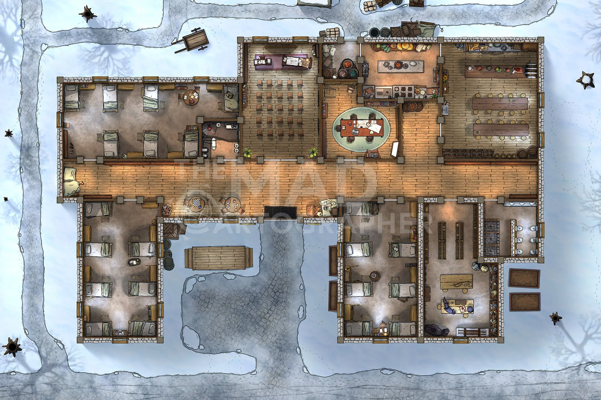 WINTER BARRACKS | 30x20 | A small military outpost building with dormitories, living area, commander's office, and armory. [π Night & Day Variants]