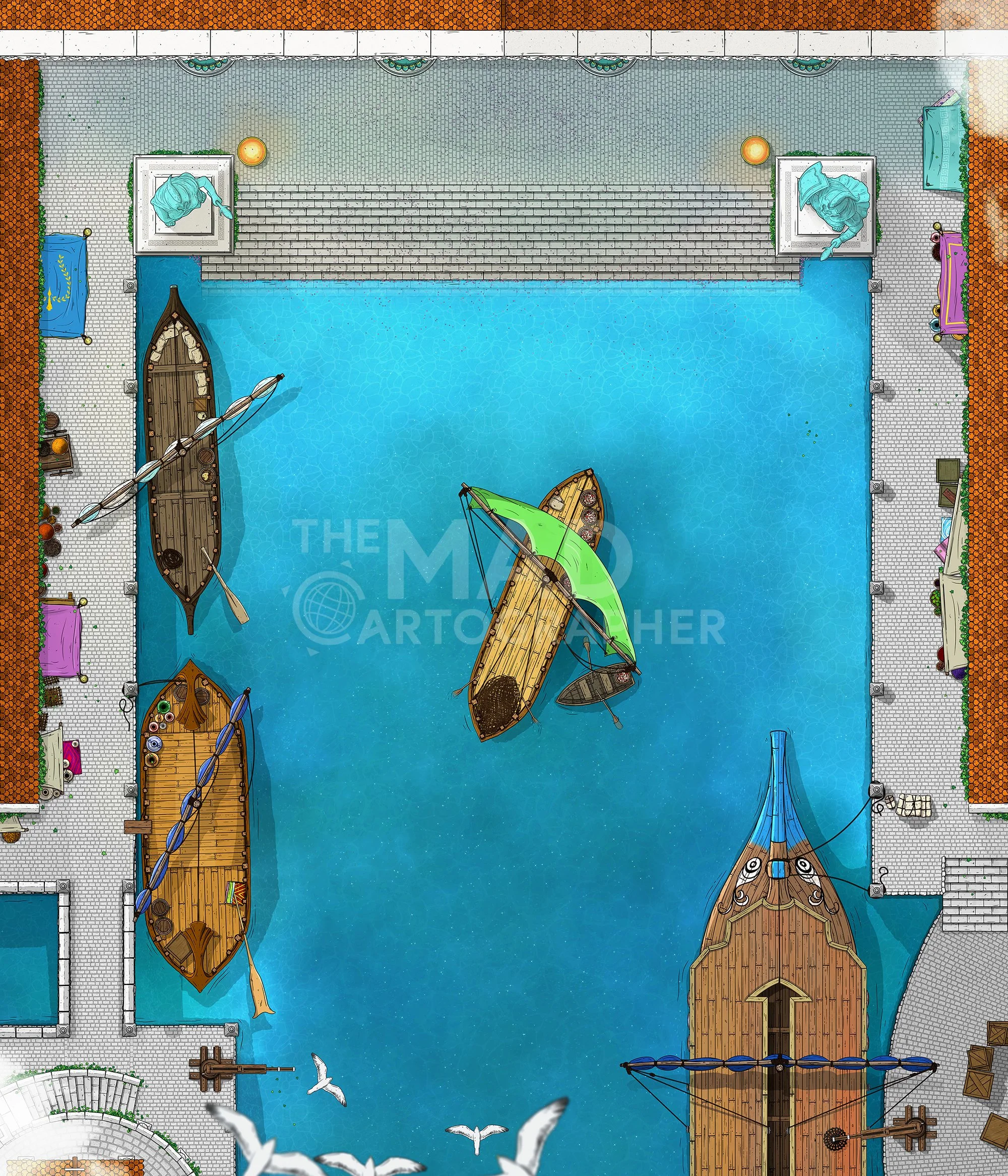 DOCKSIDE | 10x20 | A bustling dock front with access to temple steps and merchant fronts. [πͺ Asset Variants] [π Night & Day Variants]