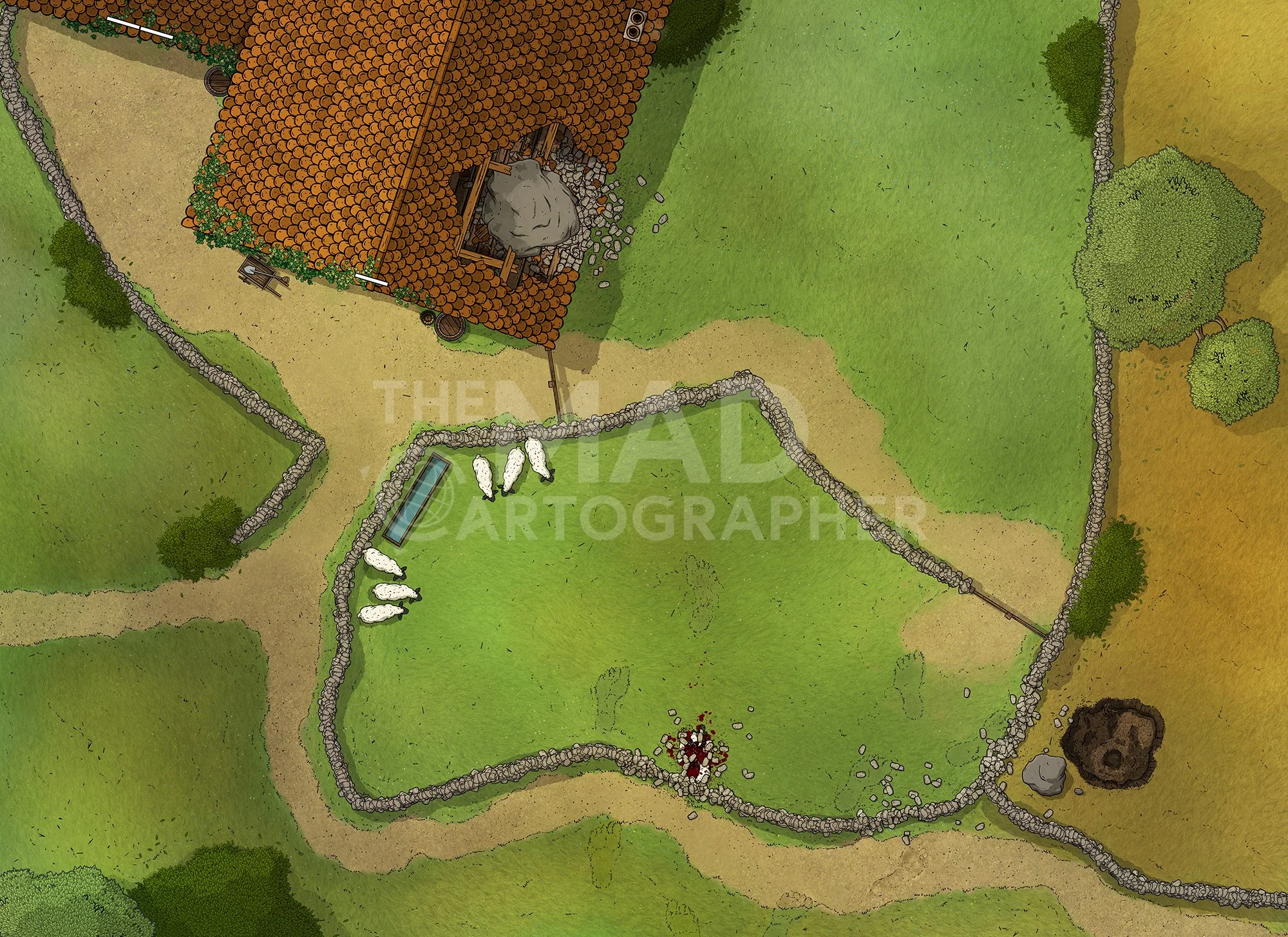 CYCLOPS RAID | 22x16 | A farm recently attacked by an ogre, featuring a smashed barn roof, sheep, and boulder damage. [πͺ Asset Variants] [π Night & Day Variants]