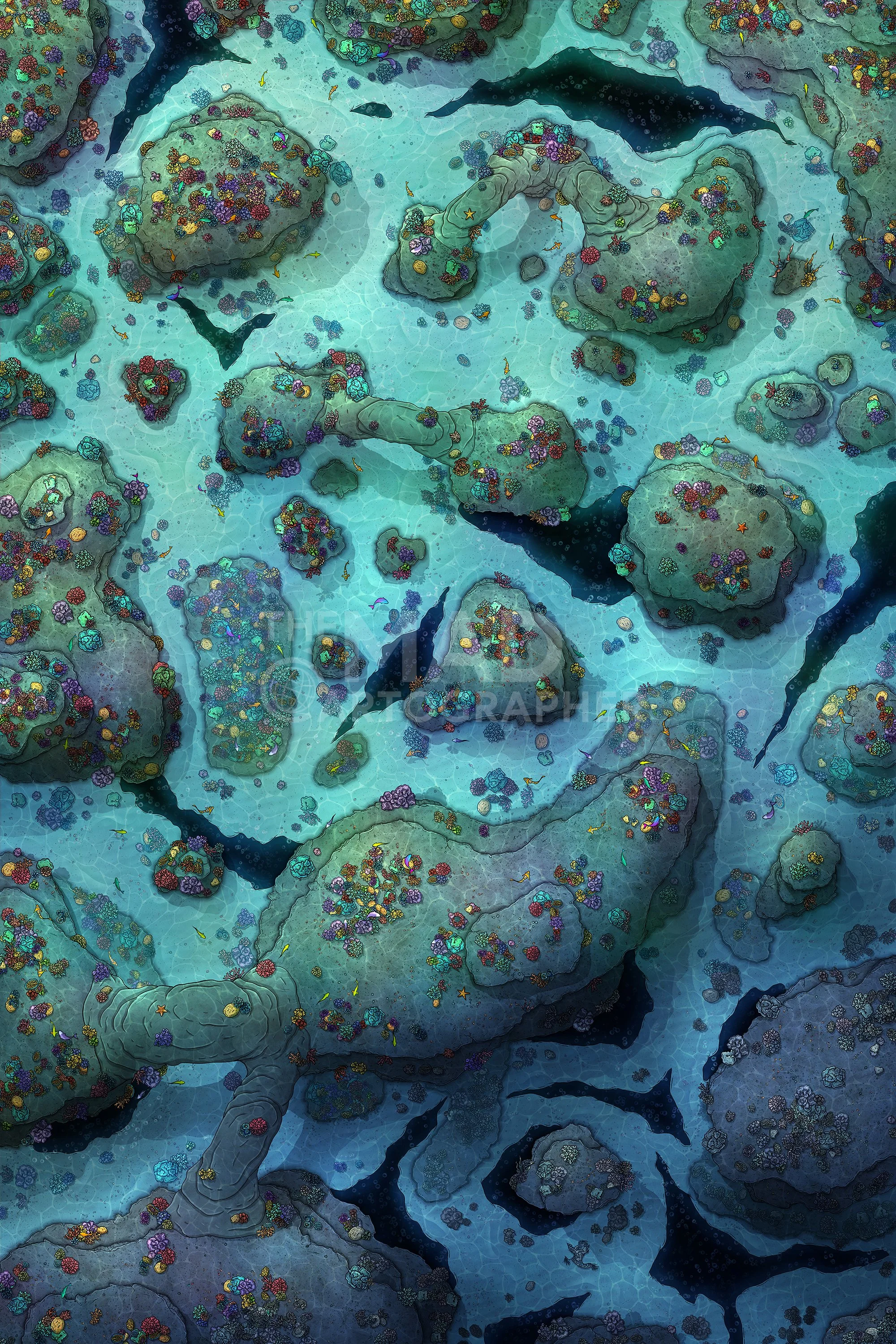 SHALLOW REEF | 20x30 | Colourful banks of coral in shallow waters, dotted with crevices leading to the depths below. [🪑 Asset Variants] [🌓 Night & Day Variants]
