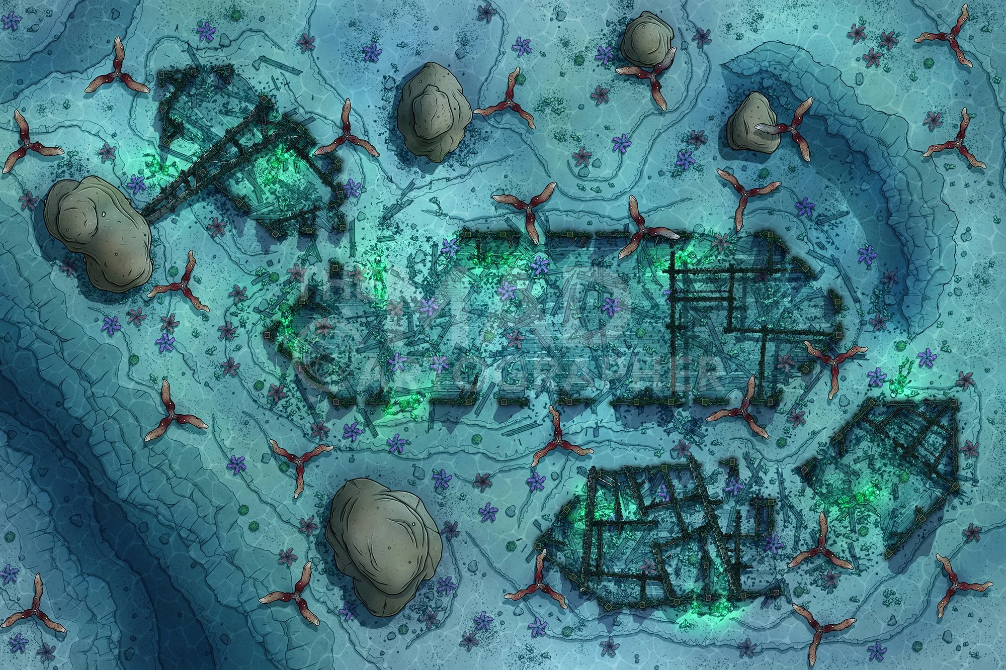 HAUNTED WRECK | 30x20 | Ancient shipwrecks litter the floor, still surrounded by the armoured corpses of their time-lost crews. [🪑 Asset Variants] [🌓 Night & Day Variants]
