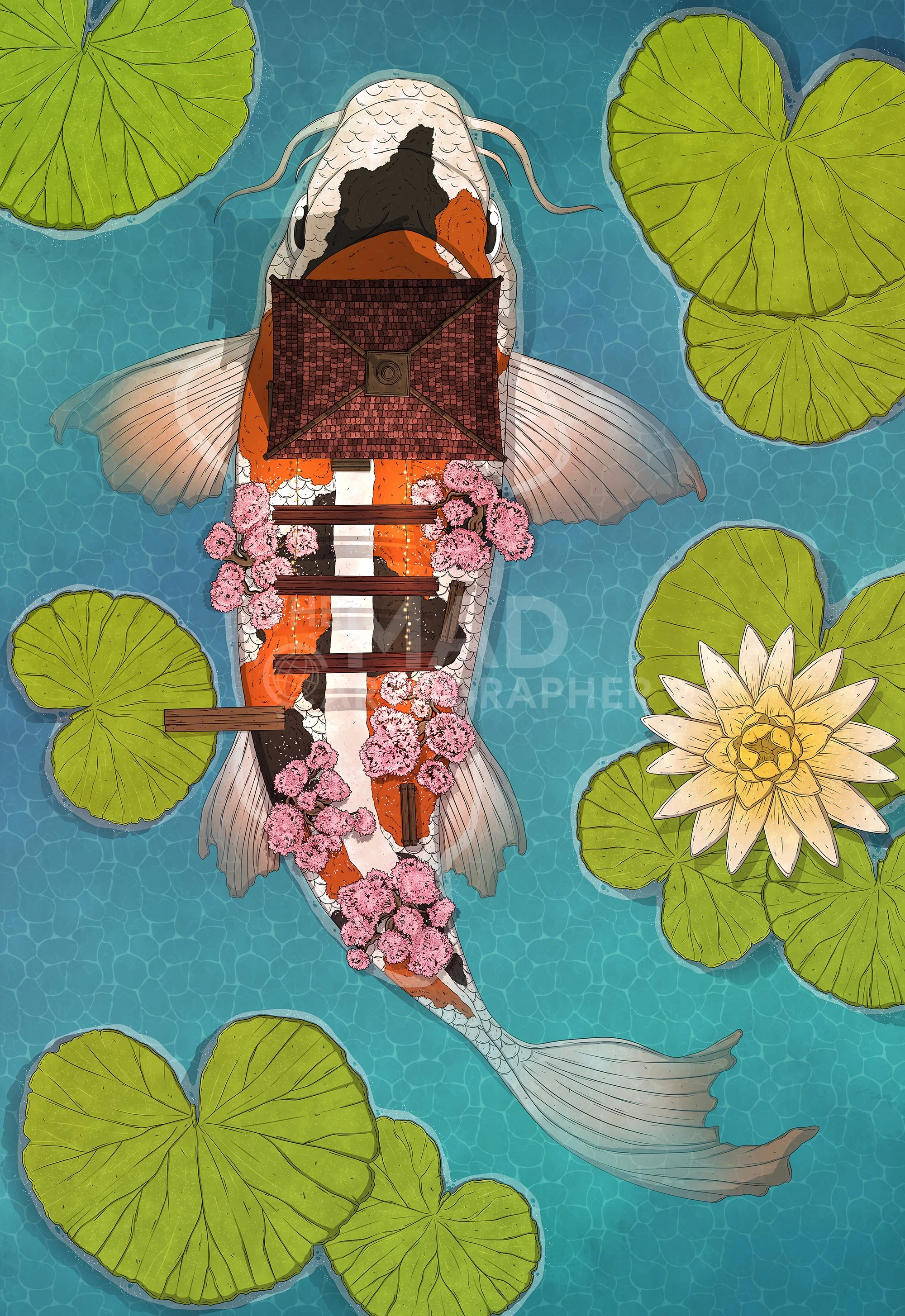 KOI PAGODA | 30x40 | A giant Koi Carp weaves its way between enormous lily pads. Small trees and a teahouse rest upon the fish's back.