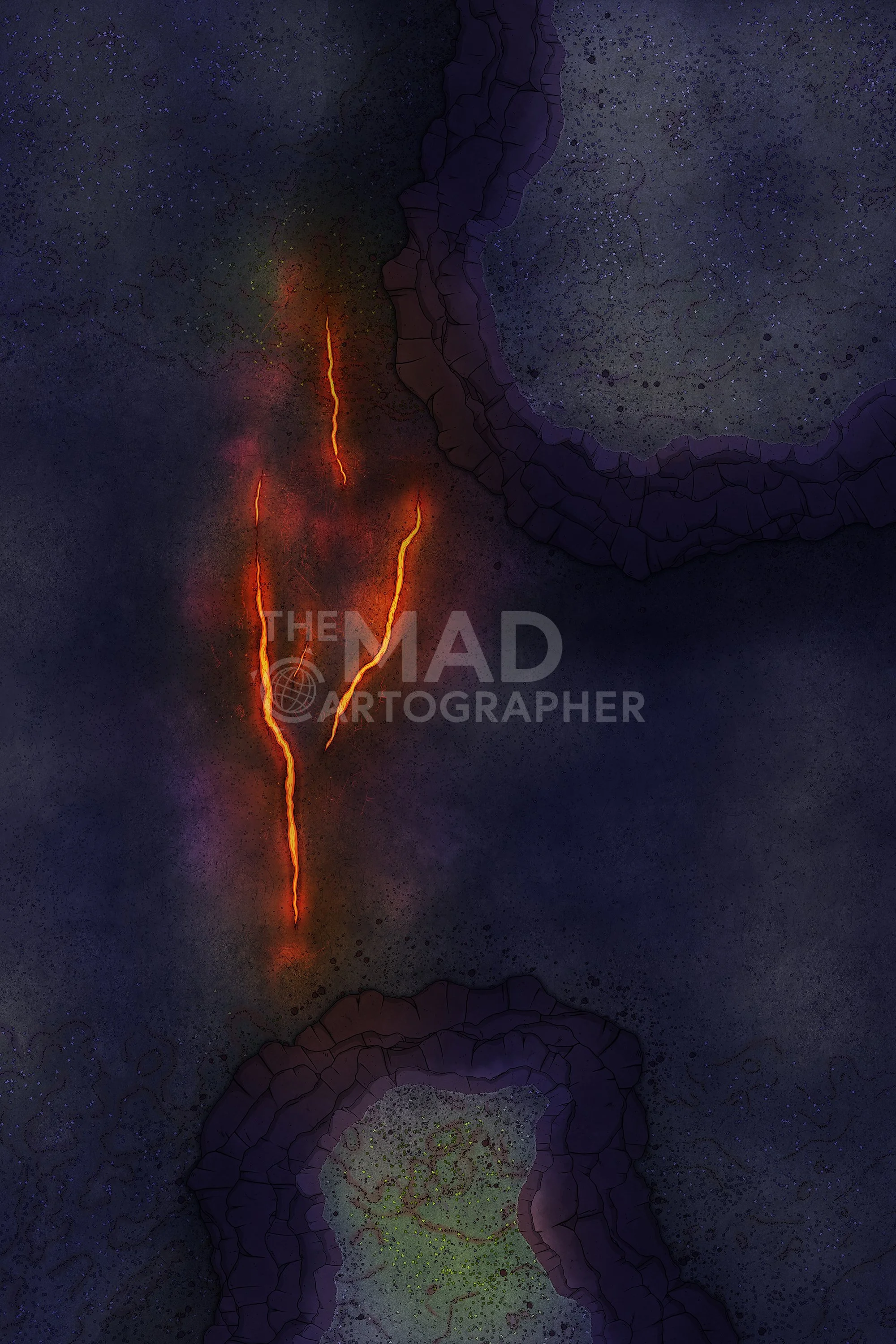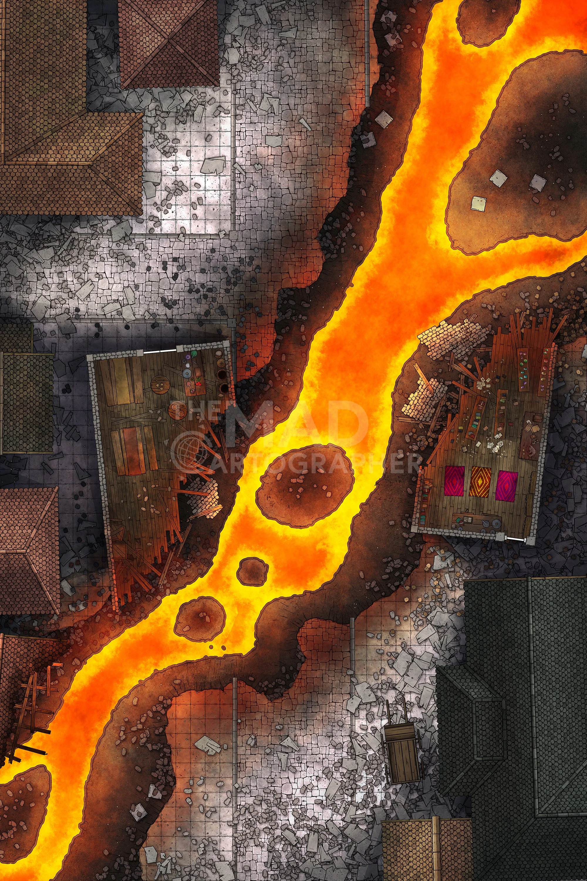 SCORCHED STREET | 20x30 | An urban street has been blasted by a fiery disaster magical or mundane - buildings rent asunder by a river of molten rock. [π¨ Multi-floor Map]