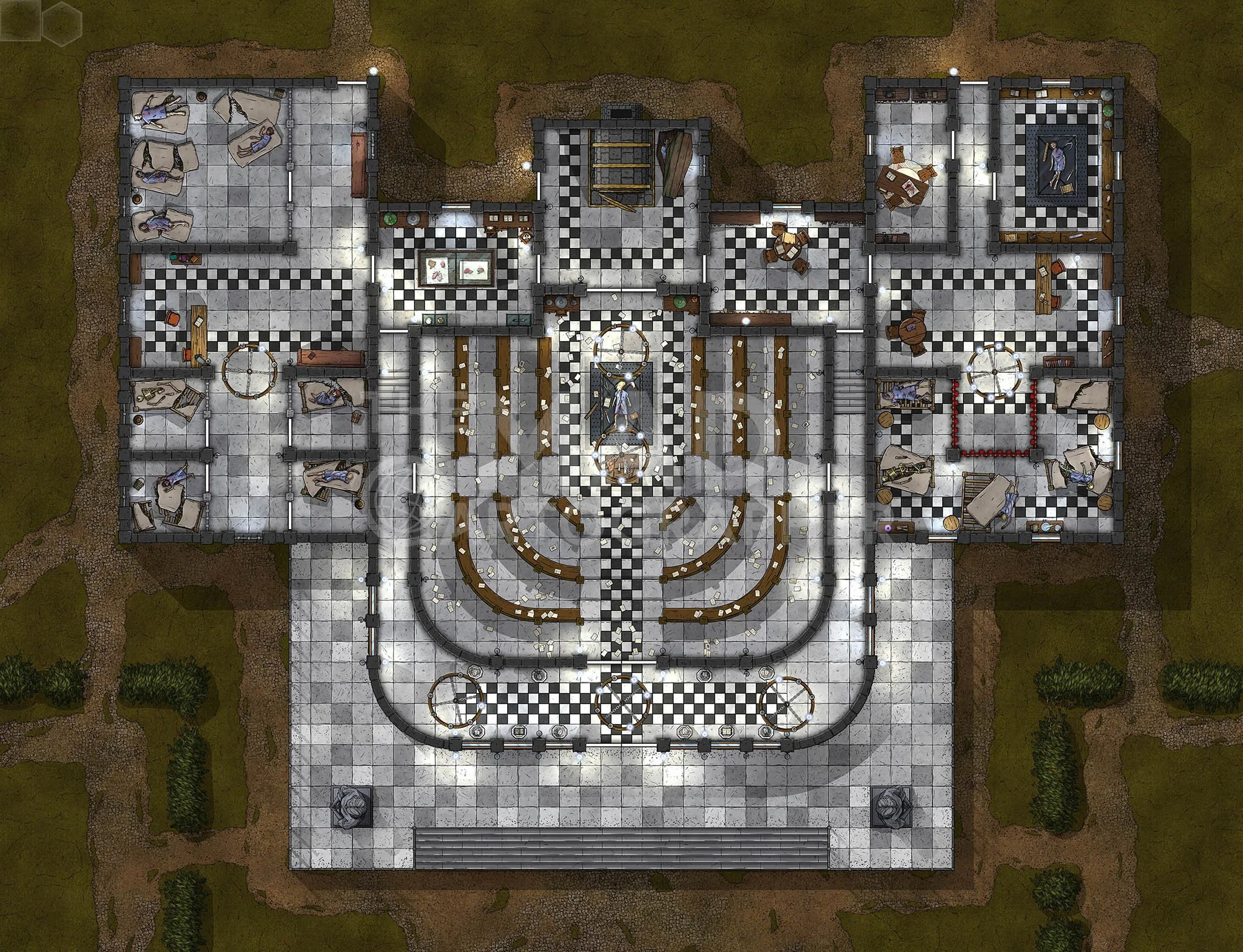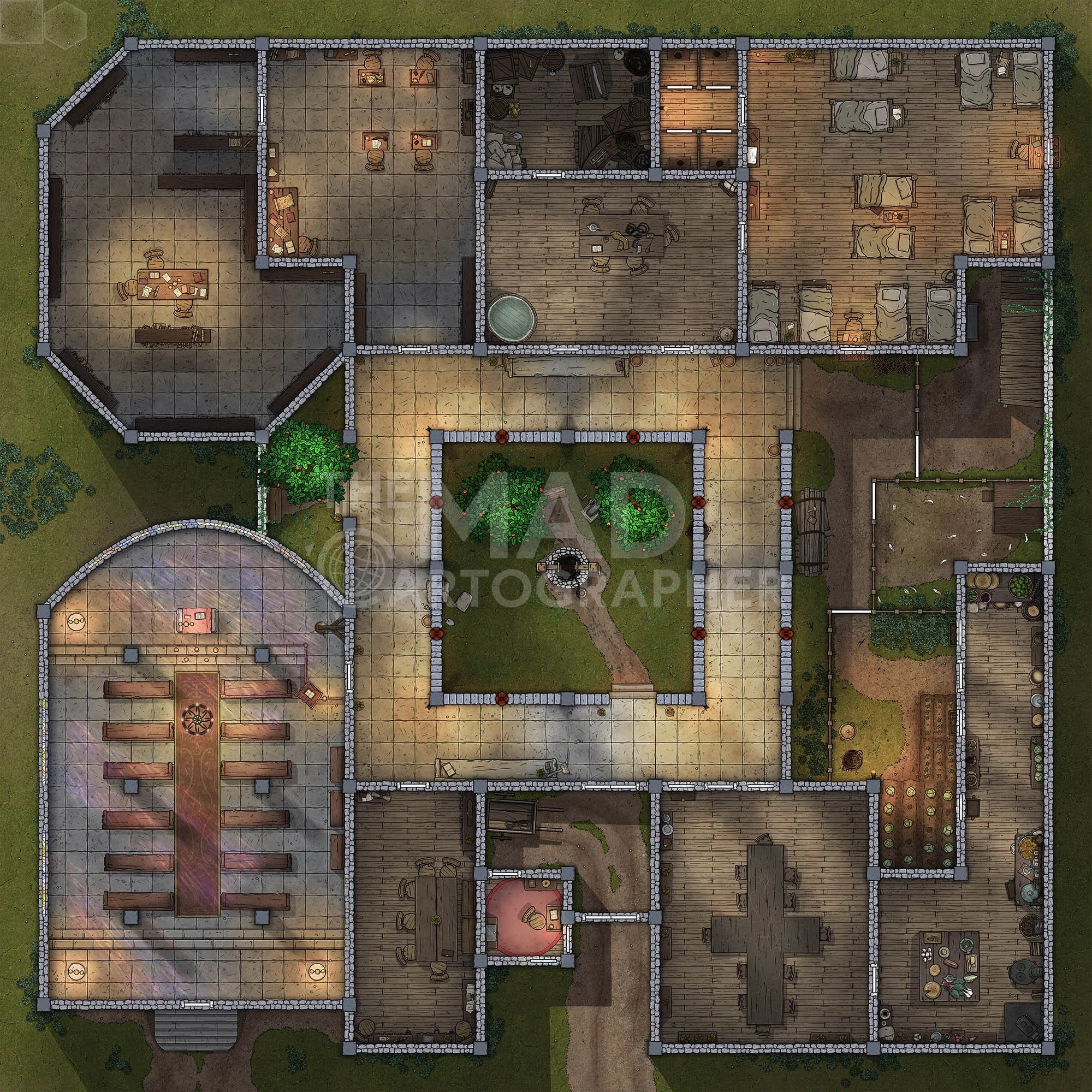 HUMBLE MONASTERY | 25x25 | A classic monastery keep, with multiple living quarters and library rooms surrounding a central cloister and orchard. [π Night & Day Variants]
