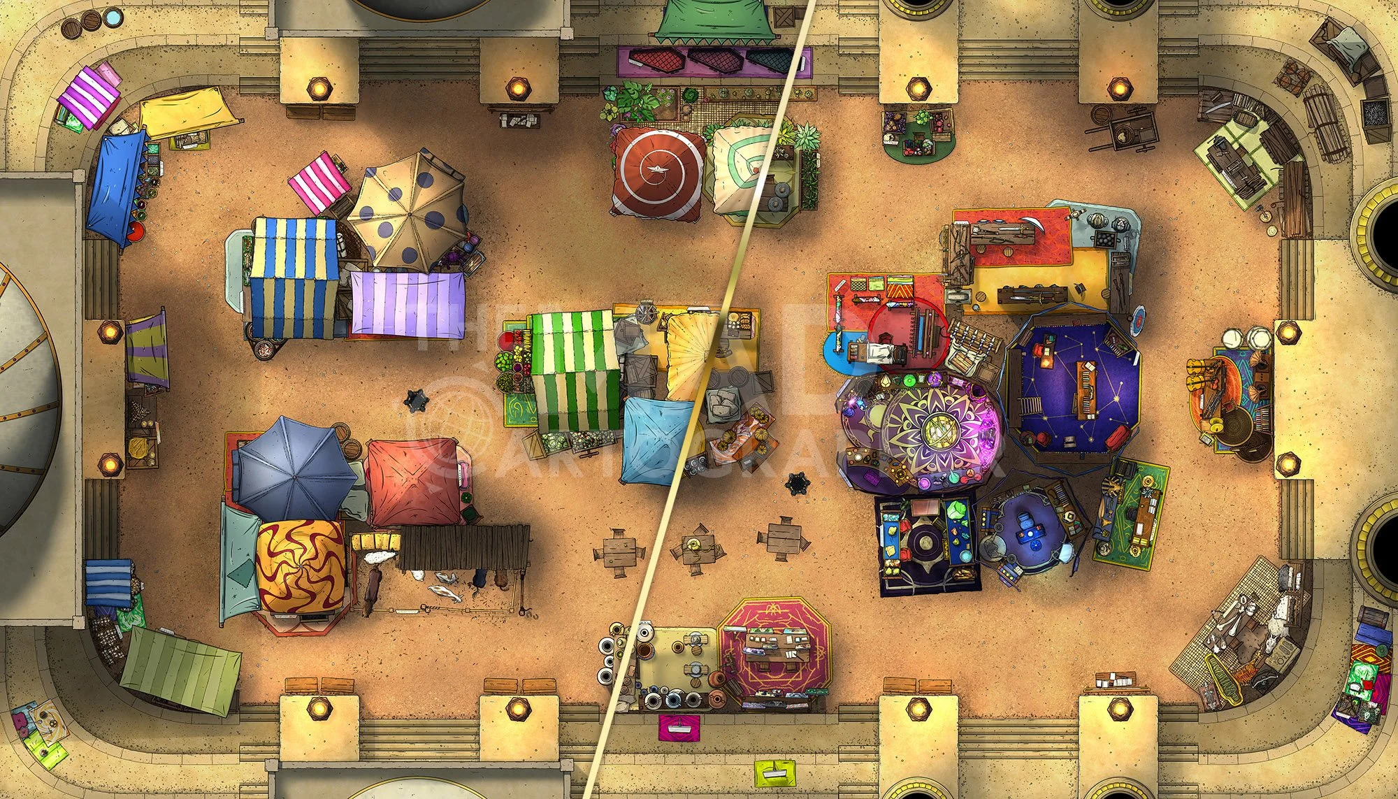 OUTDOOR MARKET | 35x20 | A sprawling outdoor marketplace in a temperate region, housed within a forum. Tents contain a number of marvellous market stalls with fantastic goods. [π Night & Day Variants]