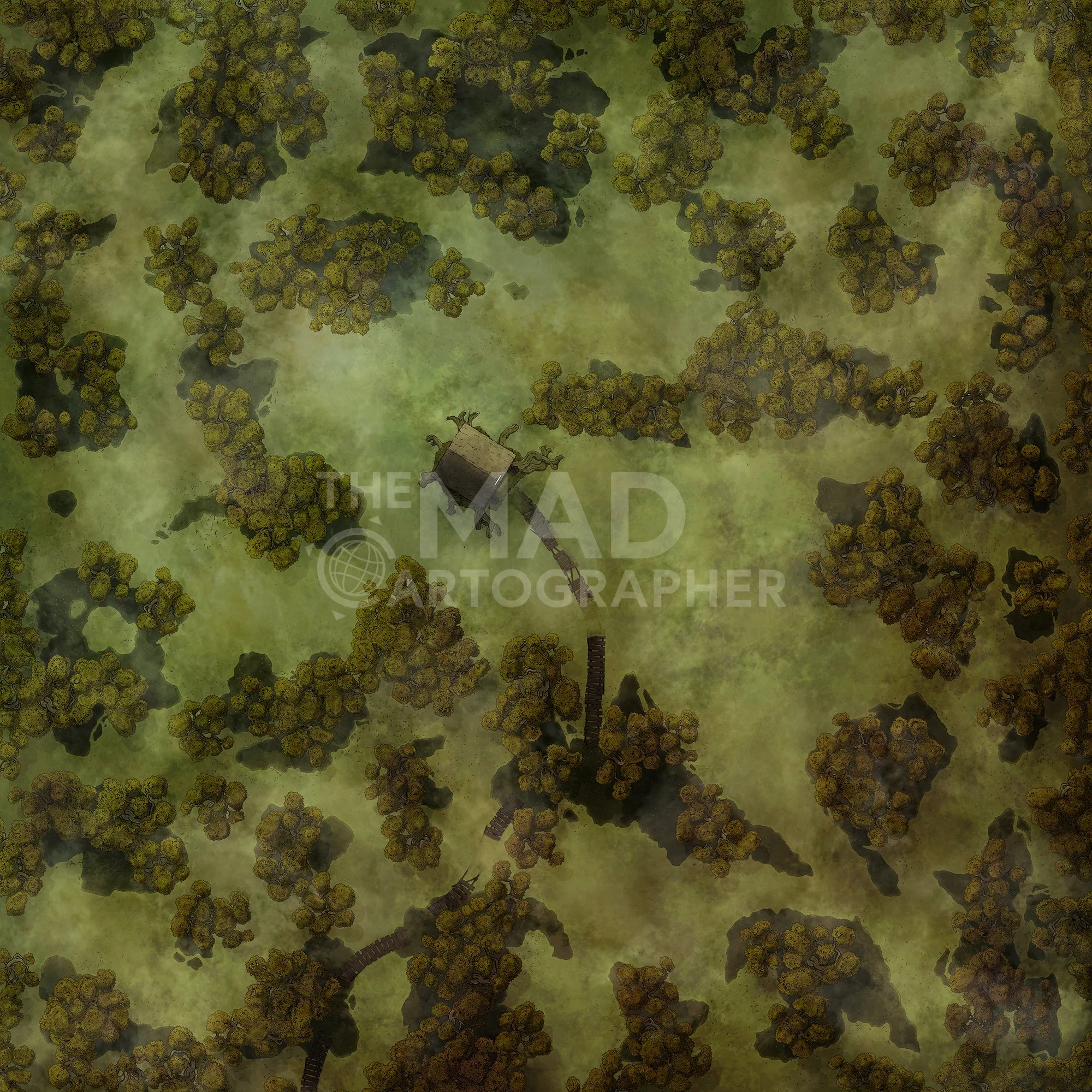 SWAMP BRIDGE | 20x20 | A damaged, winding wooden footbridge connects smaller islands in the swamp, offering a path for travelers avoiding the bog's dangers. [πͺ Asset Variants]