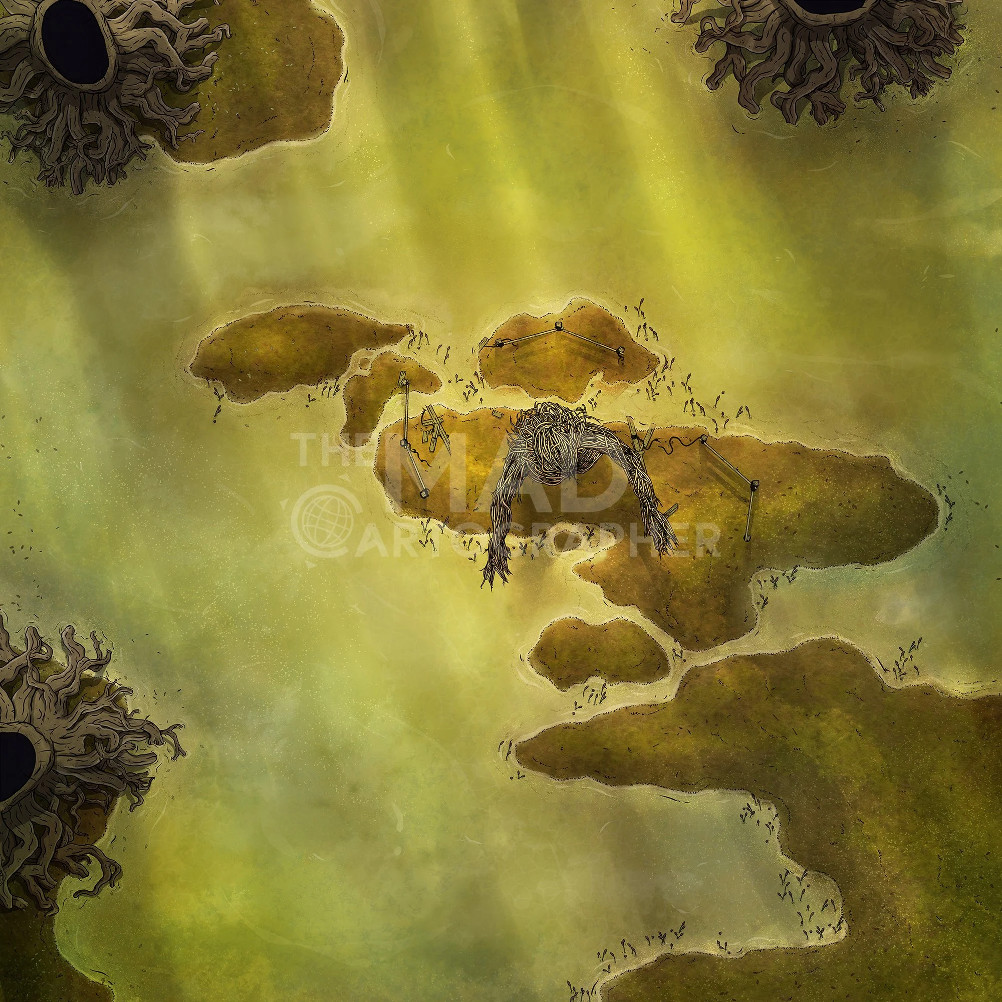 SWAMP STATUE | 20x20 | A large, eerie statue of woven branches and vines stands on small islands in the swamp, striking a lifelike pose. [πͺ Asset Variants]