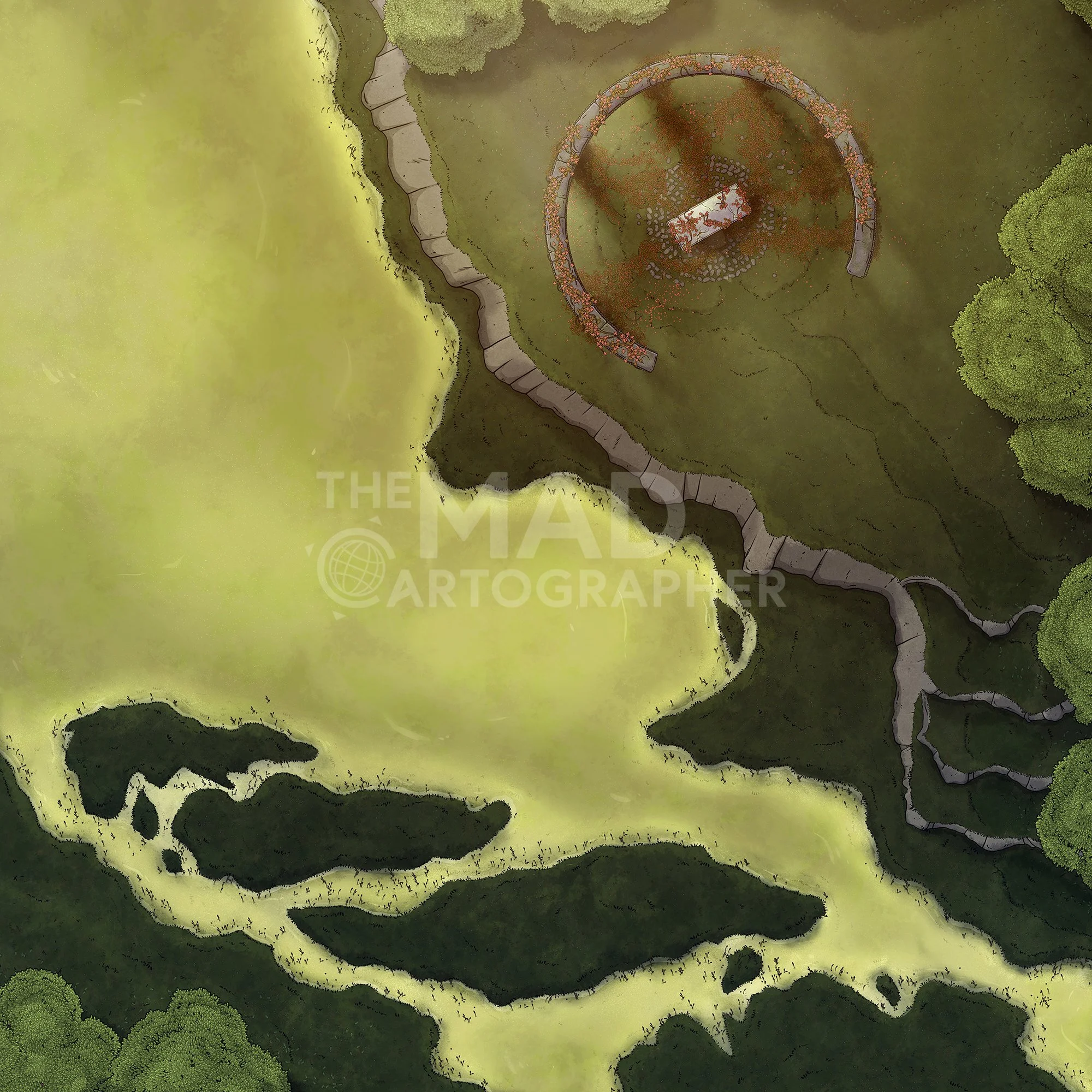 LOST SWAMP GROVE | 20x20 | A forested bluff rises from the mire with an ancient altar or stone sarcophagus at its center. [πͺ Asset Variants]