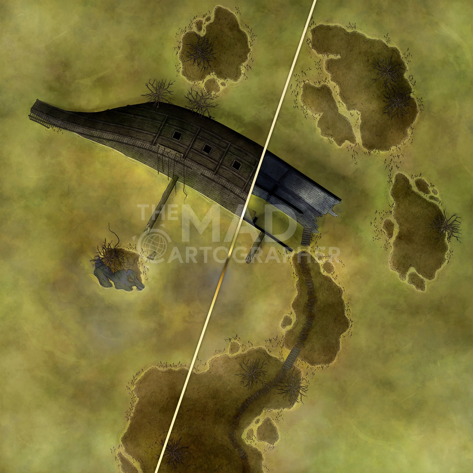 SWAMPY SHIPWRECK | 30x43 | The capsized remains of a massive wooden galleon, washed ashore in the swamp by means magical or meteorological. [πͺ Asset Variants]